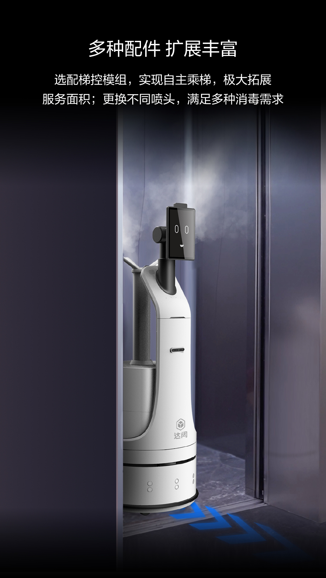 选配闸机、梯控模组,实现自主过闸机、自主乘梯等功能,极大拓展服务面积;更可更换不同雾化喷头,满足多样消毒需求